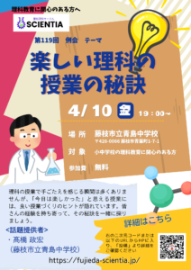 【開催日】2024 年3月24 日(日)9:30~16:30 【会場】藤枝市立青島北中学校〒426-0078 藤枝市南駿河台1-11-1 【日程・内容】 ・SCIENTIA による実践紹介(杉本・藤渕・三浦・高橋) ・ […]