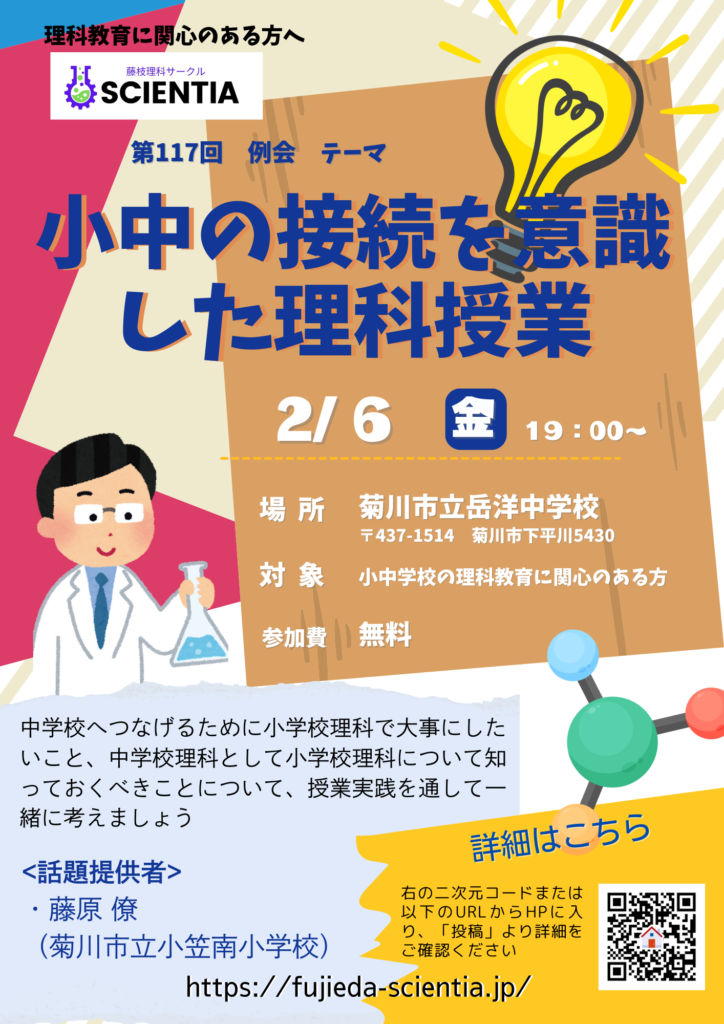 ・「小中の接続を意識した理科授業」をテーマとした資料や話題がある方は、どなたでもお気軽にぜひご準備してください。