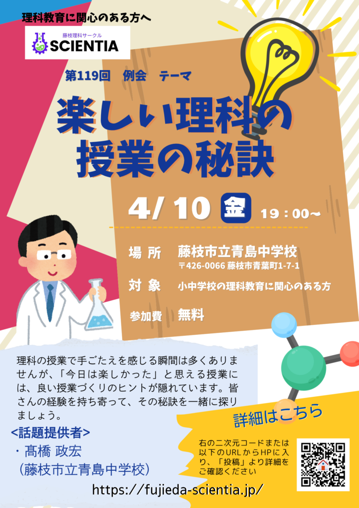 ・「楽しい理科の授業の秘訣」をテーマとした資料や話題がある方は、どなたでもお気軽にぜひご準備してください。