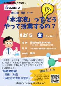 【日 時】 12月5日(金)19:00~21:00 【場 所】 藤枝市立青島中 〒426-0066藤枝市青葉町1丁目7-1 【内 容】 「水溶液」ってどうやって授業するの? など 19:00-19: […]