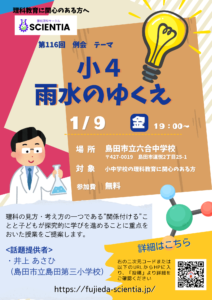 【日 時】 1月9日(金)19:00~21:00 【場 所】 島田市立六合中 〒427-0019島田市道悦2丁目25-1 【内 容】 小4 雨水のゆくえ など 19:00-19:45 話題提供 […]