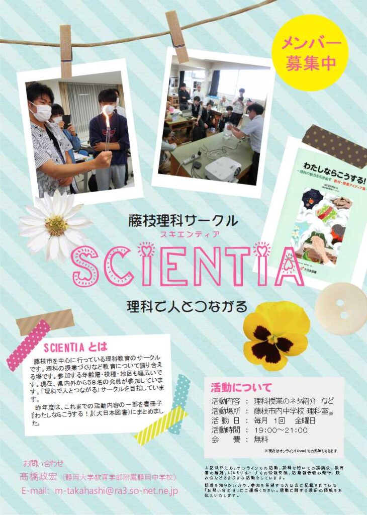 「SCIENTIA(スキエンティア)」は2015年1月に発足した、静岡県藤枝市を中心に活動している、理科教育サークルです。